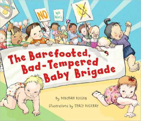 THE BAREFOOTED, BAD-TEMPERED BABY BRIGADE by Deborah Diesen, pictures by Tracy Dockray (Tricycle Press, 2010). Don’t mess with these babies — they’re staging an all-out protest crawl! Down the block, straight up main street, right into the town hall, legions of diapered, pajama-clad, nasty-tempered munchkins decide it’s high time they make their demands known and take a firm stand.