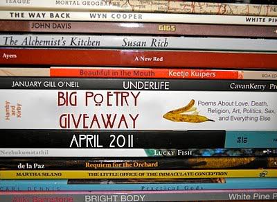 For a chance to win both books, simply leave a comment at this post no later than midnight (EDT) April 30, 2011. Extra entries for blogging, Facebooking, or Tweeting about the giveaway. Open to anyone anywhere in the world, with or without a blog. If you are commenting as “Anonymous,” please leave contact information. If you prefer, you can also enter by email: readermail (at) jamakimrattigan (dot) com, with “Big Poetry Giveaway” in the subject line.