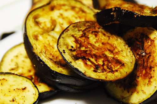 · Second adult slices and oils the eggplants and roasts the slices in a single layer in a 400° oven.