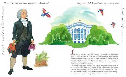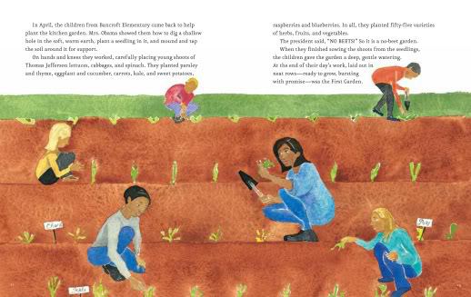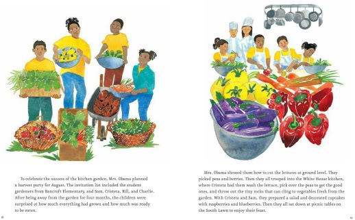 My favorite illustrations: the three chefs (Cris with strawberries, Bill atop a cupcake, Sam on a giant tomato); President Obama restraining Bo on a leash, title page featuring seed packet, students harvesting and preparing food in the White House kitchen. Yum!