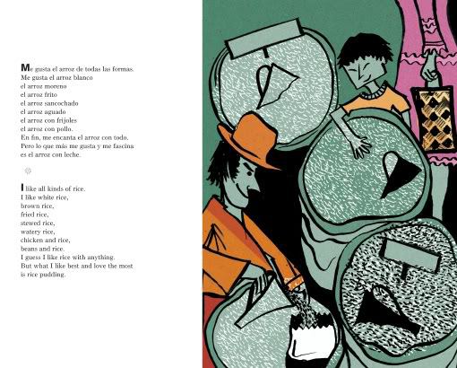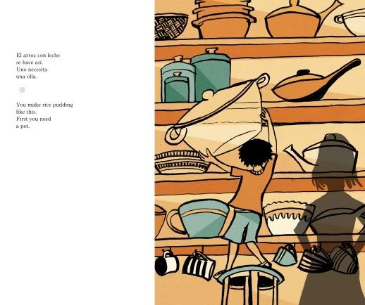 Last year, when Greg from GottaBook stopped by to share a poem and recipe at my Poetry Potluck, he mentioned Jorge Argueta’s new book about rice pudding. Since I loved Jorge’s Sopa de Frijoles/Bean Soup, I was anxious to taste his Arroz con Leche/Rice Pudding, another bilingual free verse Cooking Poem, this time illustrated by award-winning Brazilian artist Fernando Vilela.