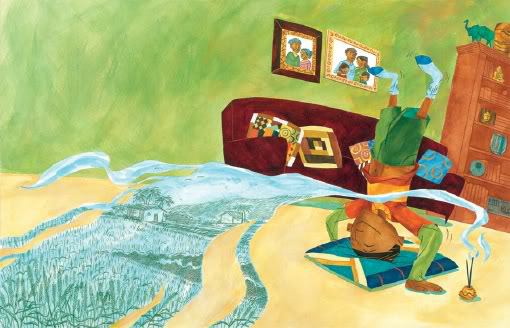 Ken Min’s lively colored pencil and acrylic illos beautifully incorporate elements of East Indian culture in a contemporary Western setting. The combination of double full-bleed spreads, story panels, and playful perspectives makes every page turn a delight. Of course my favorite spreads are the ones of Aneel making the roti — the look of serene pride and accomplishment on his face as he shapes those dough balls is priceless, and his tongue sticking out in intense concentration as he works that rolling pin nicely echoes Dada-ji’s anticipatory tongue on the cover. The tall stack of cooked roti is a delicious tall tale in itself, and what about that spiraling queue of villagers waiting for Badi-ma’s roti? Just like the tiger power being unleashed from within Dada-ji! ARRE WAH!