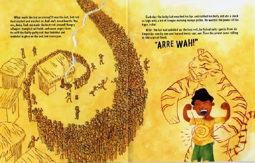 And where did Dada-ji get such incredible strength? By eating his mother’s hot, hot fluffy-puffy roti, of course! It was SO good, people “trampled tall fields and swam angry rivers” for just one taste or sniff of the bread that sizzled and wizzled on Badi-ma’s hot tavva pan. Dada-ji ate a tall stack every day with a side of tongue-burning mango pickle, and this gave him the power of the tiger (“ARRE WAH!”).