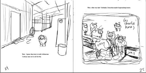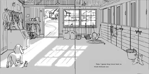 When we added 8 pages to the book, I had room to spread out the barn scene to a full spread.