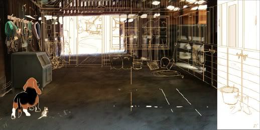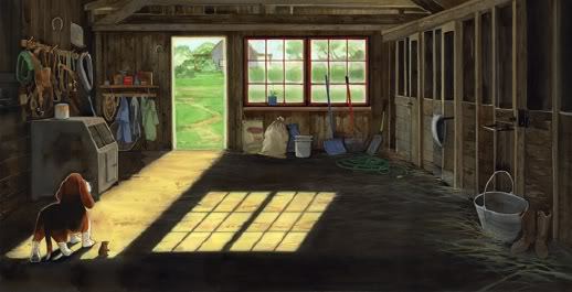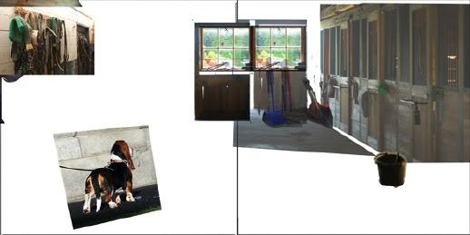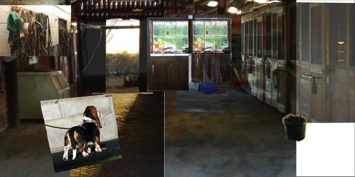 Once I got all the material together I sketched over it (digitally) and played with the lighting and added details: tack, shovels, bags, dog food, cooler, hose, bucket, boots, etc.