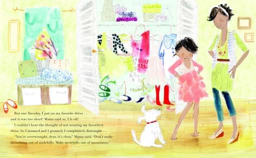 Here’s a girl who love love loves her salmon-colored, striped-bodice, ruffly-skirt dress, wearing it every single Tuesday, her favorite day of the week. But one day, her favoritest dress ever is just too short and she’s beside herself. Mama comes to the rescue, advising that instead of making mountains out of molehills, she make molehills out of mountains. So, with a “SNIP, SNIP, sew sew” — it’s “New shirt, hello!”