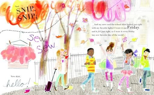 Thus begins a series of clever, wholly satisfying transformations. When the shirt becomes too tight, Mama turns it into a tank top, then a more school-appropriate skirt, a tassely scarf for winter, a pair of cozy socks, and a pretty hair bow. And what happens when puppy shreds the bow into teeny tiny scraps? The girl creates something all by herself that enables her to wear her favoritest dress “every day of every season of every year.” Brilliant!