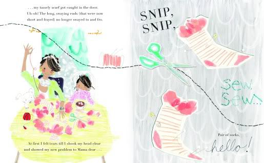 Julia’s exuberant mixed media illustrations (watercolor, graphite, colored pencil, needle and thread collage) — so fresh, child-like, and evocative — perfectly complement Boni’s spirited, patterned text (loose internal rhymes, alliterative tag lines, days-of-the-week structure). Readers will be anxious to see what the “dress” will turn into next, and will love poring over each stylish spread with its cheery colors, paper cut-outs and endearing stitches. What a beautiful celebration of creativity and all things handmade. Très chic!