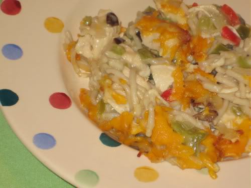 Ok, while I admit that I’ve never heard of Chicken Spaghetti, I have to say that it sounds almost exactly like Turkey ala King, which would make this Chicken ala King, I suppose. 🙂 But, otherwise, the flavors sound very very similar. And tasty.