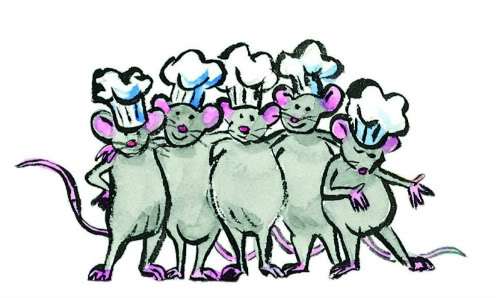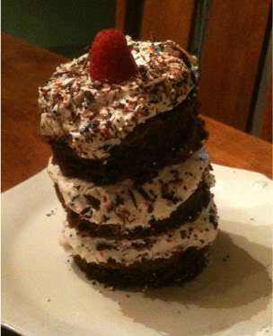 Basically, I gathered together tried and true recipes, then mixed and matched ingredients (kind of like the mice). I also tried to incorporate ingredients that would appeal to kids, like chocolate syrup and marshmallow fluff. The first prototype (pictured here) was a very vertically-challenged, but tasty little cake. I’m hopeful that kids will come up with their own “jumbled up” versions and send me lots of photos!