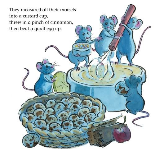 So you can imagine how giddy I was to read The Little Bitty Bakery, a thoroughly charming tale of an elephantine pastry chef who bakes away her birthday. How her heart aches when she realizes it’s too late to celebrate. She’d worked so hard making treats all day long, but now there would be no birthday cake for her. She climbs into bed and in the middle of the night is awakened by the aroma of scrumptious “swirls of sweetness.” When she goes downstairs, she discovers a delightful surprise — a Crumble Jumble Cake prepared by the mice! “They had a celebration and nibbled cake till dawn./ When they set their napkins down, every crumb was gone.” Such heartwarming goodness!