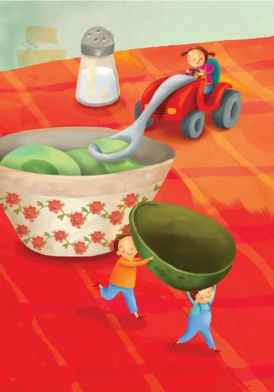 I totally agree with Jorge on Margarita Sada’s adorable illustrations — she’s captured the full-out joy of making this simple, healthy recipe with bright colors and whimsical details. Who wouldn’t want to live in a giant avocado house and slide down the table inside a peel?
