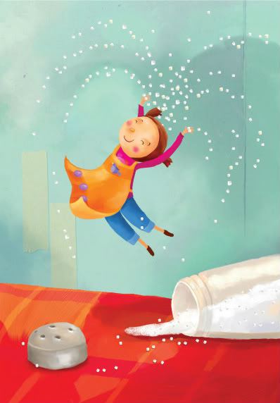 Argueta’s poetic imagination transforms big, beautiful avocados into “green precious stones,” cilantro into “little trees,” the mixing spoon into a tractor scoop. Sensuality abounds in his kitchen — you can just feel the soft, ripe fruit with its slippery pit (“round as a small world”) in your hands, smell the fresh green smell of cilantro, your mouth puckering at the thought of “the sour river of lime,” its juicy juice “that comes like tears.” There is a wonderful sense of empowerment as the girl puts on her special apron, sings and dances around the kitchen, and finally shares what she made all by herself with her family. When was the last time you sang to the salt and viewed cooking as a fun activity capable of renewing your appreciation for everyday things?