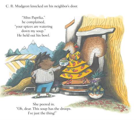 I’m happy to report C.R.’s “cure” is all about food (see why I like Leslie’s work so much?). To nurse Paprika back to health, he adds a few things to his usual fare: lemon in the tea, salt in the soup, and the sweetest, most perfect fig he can find. Comfort food, a caring gesture, learning to be a friend. Not bad for a grumpy fuss budget who’s actually quite endearing. A great way to show kids the value of compromise and moderation, as well as the importance of being open to change for its unforeseen rewards. As Paprika says, “Good friends are the spice of life.” C.R. Mudgeon is the perfect read aloud, just what the doctor ordered, especially for shy kids and short grown-ups of the fuddy duddy persuasion.