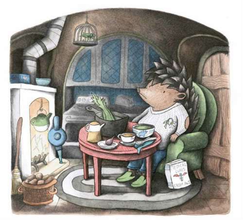 Every night he snuggled his hedgehoggity feet into his woolly slippers. He sat in the same old chair. He wore the same soft raveled sweater. And he read his favorite book — Medical Cures from A to Z — by the crackle of a single twig.