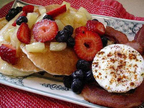 Or maybe pancakes. No, it’s fruit, cut up in bite size blocks.Or wait a second. Let me think: