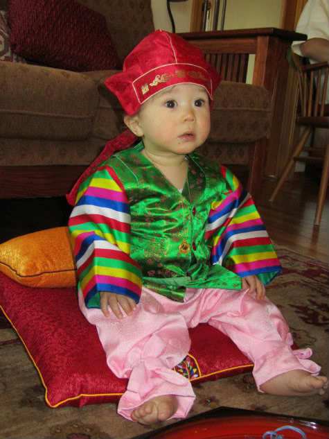 My Aunty Sylvia requested that I make Chi Chi Dango (rice cakes) for my cousin Everett’s first birthday. The rice cakes are part of the doljabi (ritual) in which the baby chooses his life path. We cooked for almost six hours making japchae, kimchee, vegetable jun, puchim, namuls, potato salad, wakame cucumber salad, and mujigaedukk.