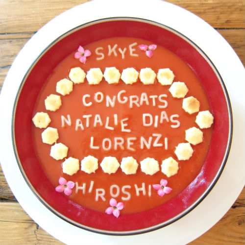 Now, please help me congratulate Natalie. Six humble Alphabet Soup kitchen helpers prepared today’s celebration soup while noshing on yomogi mochi and green tea. They are now obsessed with hexagonally-shaped food and have taken to eating six servings of everything. In keeping with Japanese custom, feel free to slurp enthusiastically right from the bowl, the louder, the better.