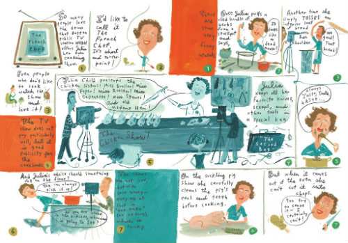 We’re tickled pink that award-winning author, illustrator and commercial artist Jessie Hartland is here today to help us celebrate Julia Child’s 100th Birthday. Her graphic biography, Bon Appétit!: The Delicious Life of Julia Child (Schwartz & Wade, 2012), has everyone drooling with delirious delight.
