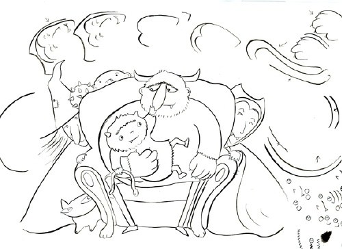 To create the artwork, I did the paintings in acrylic and various dyes and ink washes on watercolor paper. I painted the line in India ink on opaque vellum. Then I scanned both into the computer and put them together digitally. I did this because I was apprehensive about doing line work and having it on a separate layer made it easier to correct any mistakes I made. I also used separate layers for the ink washes. This gave me more control on the values in the illustrations. For example, for the cover, I made a wash of India ink that I scanned in and put on a separate layer from the painting of the characters. I could make certain areas lighter, for example the cat’s eyes, by “cutting away” parts of that dark wash layer.
