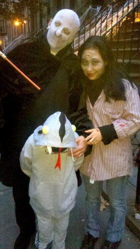 As an adult? Hmmm….We tend to do Halloween pretty big here in Brooklyn, so most Halloweens since Jamie has been born have been a lot of fun. Last year, Jamie decided to be a character from Harry Potter. Being Jamie, he didn’t want to be Harry or Ron, or even Dumbledore…he wanted to be Nagini, Lord Voldemort’s snake. Which meant that I got to be Lord Voldemort. I tried to scare all the little Harrys and Hermiones running around, but they were too tough for me.