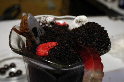 - Spoon some chocolate pudding into glass cups (it’s more fun to see what is buried in the “dirt”!) You can place gummy worms or other creepy candy creatures on top, then cover with more pudding.
