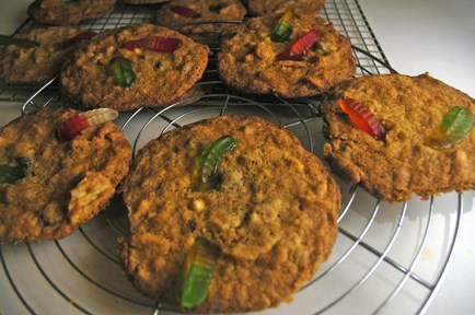 Graveyard decorations (Halloween candy, gummy worms, fondant shaped into creatures)