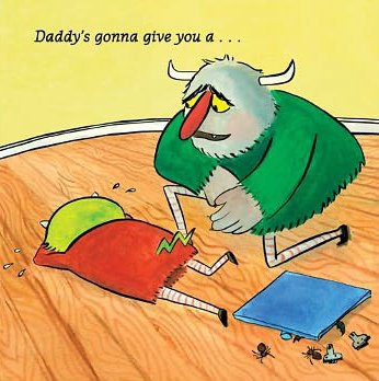 I get a kick out of the classic “Zombies breaking down the door and coming through the walls” but instead of being horrified, the family is delighted to see them, with the Monster Daddy seeming to say “Hey Zombie, what took you so long?” and the Daddy Zombie saying “The Traffic was a nightmare!” I also like that Little Monster has gotten a playmate!