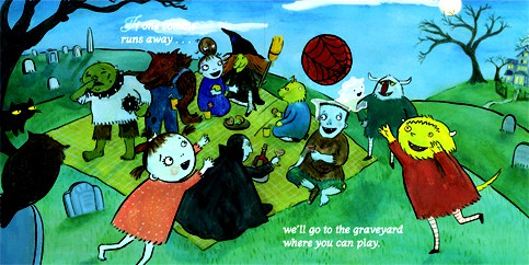 D: This was a hard one, as I like so many of them. But I’m going to pick the “Zombie Invasion” picture for a couple of reasons. First off, it was a late addition, as originally after the broom flies away, the verse went: If that broom won’t sweep as planned, Here comes our friend the Zombie to lend a hand. If that Hand just runs away/You’ll go to the graveyard where you can play.