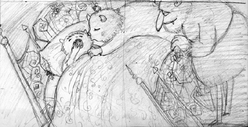 M: I went through several different approaches with the artwork. I tried all digital, then traditional painting. Nothing seemed right. Then our editor told me they really wanted line work to be a part of the work and so I incorporated line using brush and ink. I’m actually pleased with the way it turned out in the end. I think my favorite piece is the spread where they are kissing him “good night” and the spiders are falling out of his pillow.