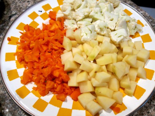While pawing through Jane Brody’s Good Food Book (W.W. Norton & Co., 1980), he found “Peanut Butter-Vegetable Chicken Soup.” Aha! Lots of veggies and no cream! So I played sous chef, chopping, slicing and dicing, while Cornelius supervised. (In my next life, I will have a cadre of trained sous chefs resembling George Clooney, Paul McCartney, James Taylor and Bob Dylan.)