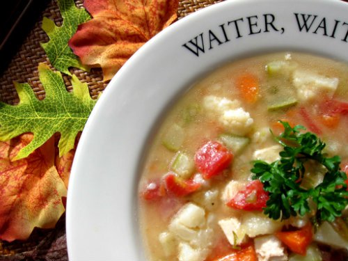 2. Add the zucchini, broccoli or cauliflower, tomatoes, celery, onion, green pepper, and garlic. Simmer the soup for about 8 minutes.
