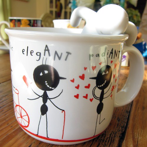 I think the “Votes for Women” cup and saucer came from a museum shop. Alice in Wonderland is from a tea set, the alphabet one is actually a soup bowl from Anthropologie, the ant cup was a gift, blue polka dot from Pottery Barn.