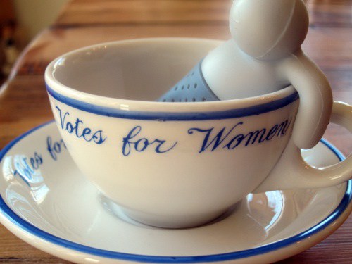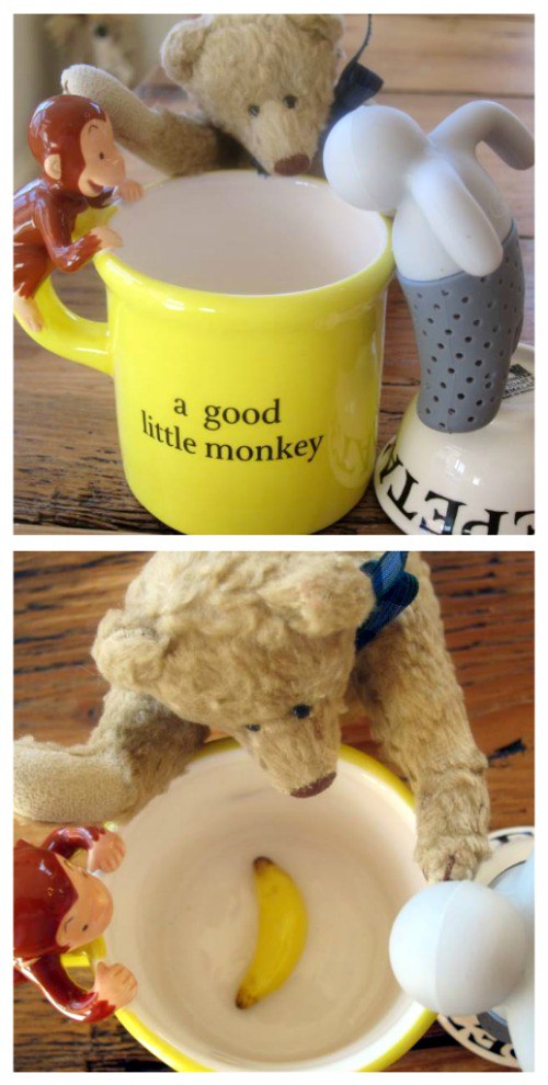 Cornelius wants to clarify that it was Mr. Tea who sniffed at the Votes for Women cup (he obviously hasn’t been around as much). This was also Mr. Tea’s first banana. 😀