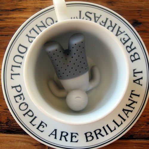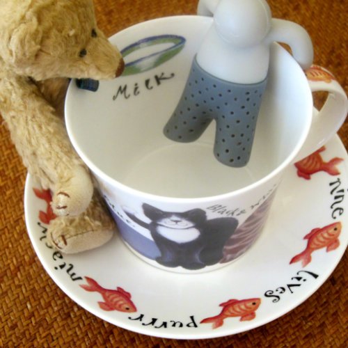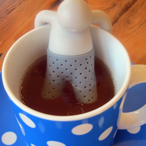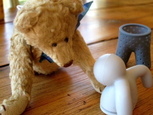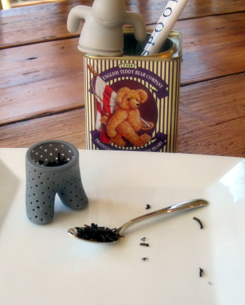 Tips: He works better with larger cut loose tea — unless you don’t mind little tea bits leaking from his pants. (Hold onto your strainer.) His pants can be turned inside out for washing. He’s quite well behaved and loves to be read to. Enjoy! 🙂
