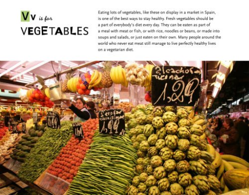Caldicott uses single photos or photo collages for each letter of the alphabet to showcase a specific food or food-related essential (journeys, kitchens, markets, quantities), paired with a concise paragraph describing how the food is commonly eaten, obtained, processed and/or prepared. He also unobtrusively slips in a nod to healthy eating habits (the value of fresh fruit and veggies, or honey over refined sugar, etc.). The emphasis is on whole foods, fair trade, sustainable crops, and conservation.