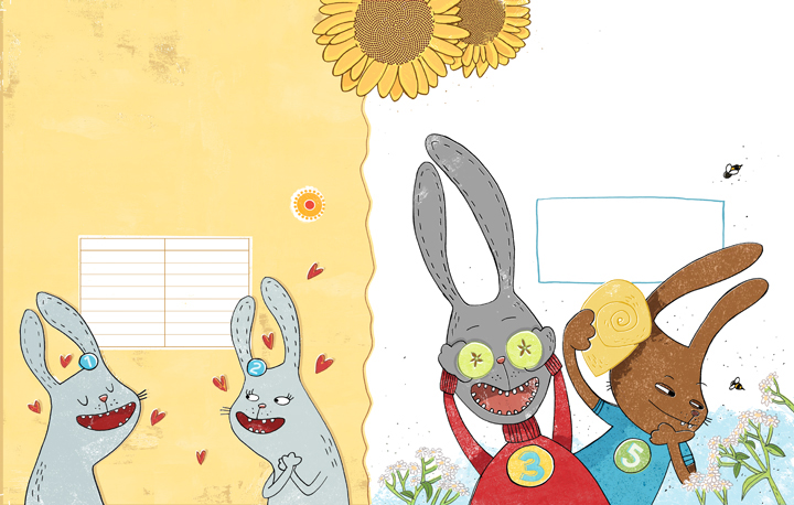 When I first started working on sketches, I thought that the rabbits would be considered too young for the book- they were more like little fluffy bunnies at the time. I did some research and tried to redo the art using human child characters but it didn’t work at all. Instincts told me to go back to the bunnies but I made them a little older, more tween-like. I’m glad I did, I love the rabbits now.