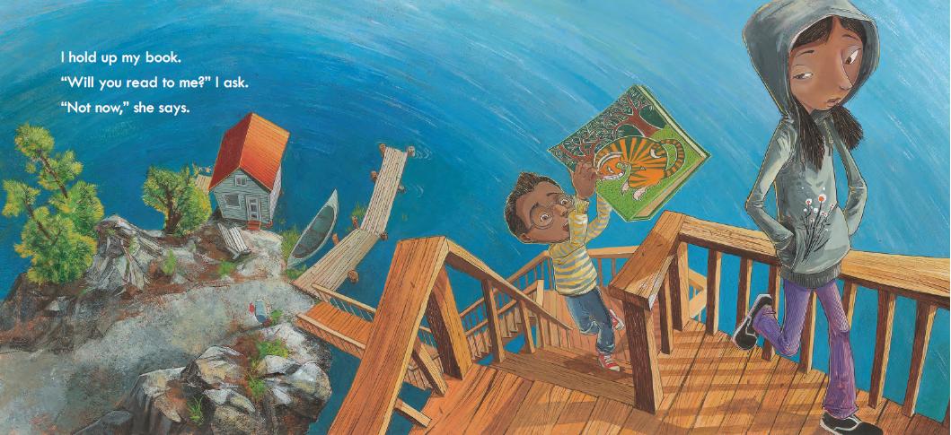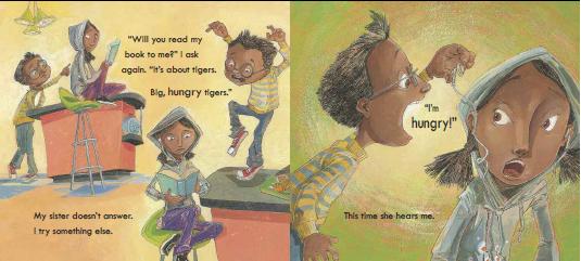 In Tiger in My Soup by Kashmira Sheth and Jeffrey Ebbeler (Peachtree Publishers, 2013), a young boy left in the care of his older sister begs her to read his favorite tiger book to him. Alas and alack, she is too absorbed in her own book to pay him any attention, prompting the boy to pull out his most imaginative stops to get her to change her mind.