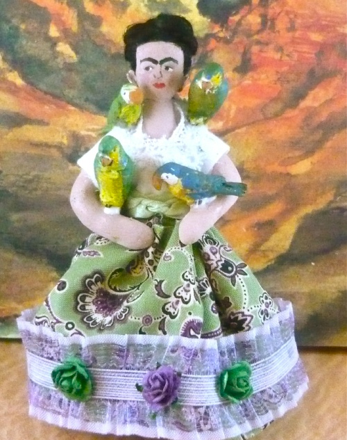 Frida Kahlo with her pet parrots is one of my popular characters that I sell a lot of. I was inspired to make the character after I read some history behind her and thought she was very interesting.