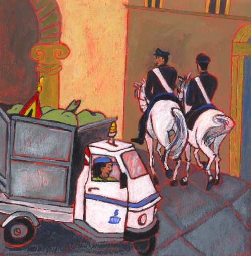 The illustrations are painted in acrylic. Many are from photographs that I took or found. The second page — the little girl sitting on the steps — is from a photo I took of my daughter in Pienza long ago.