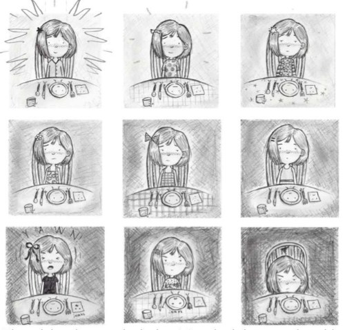 This story kind of just set itself one night. I was visiting my parents for the summer (I was in college at the time) and at dinner we were recollecting how my sister could never seem to remember how to set the table as a kid. My sister and I took turns setting the table and doing the dishes, so you would think she would have it down! Anyways, I was doodling and scratching away in my sketchbook later that evening and what came of it was THE TABLE SETS ITSELF.