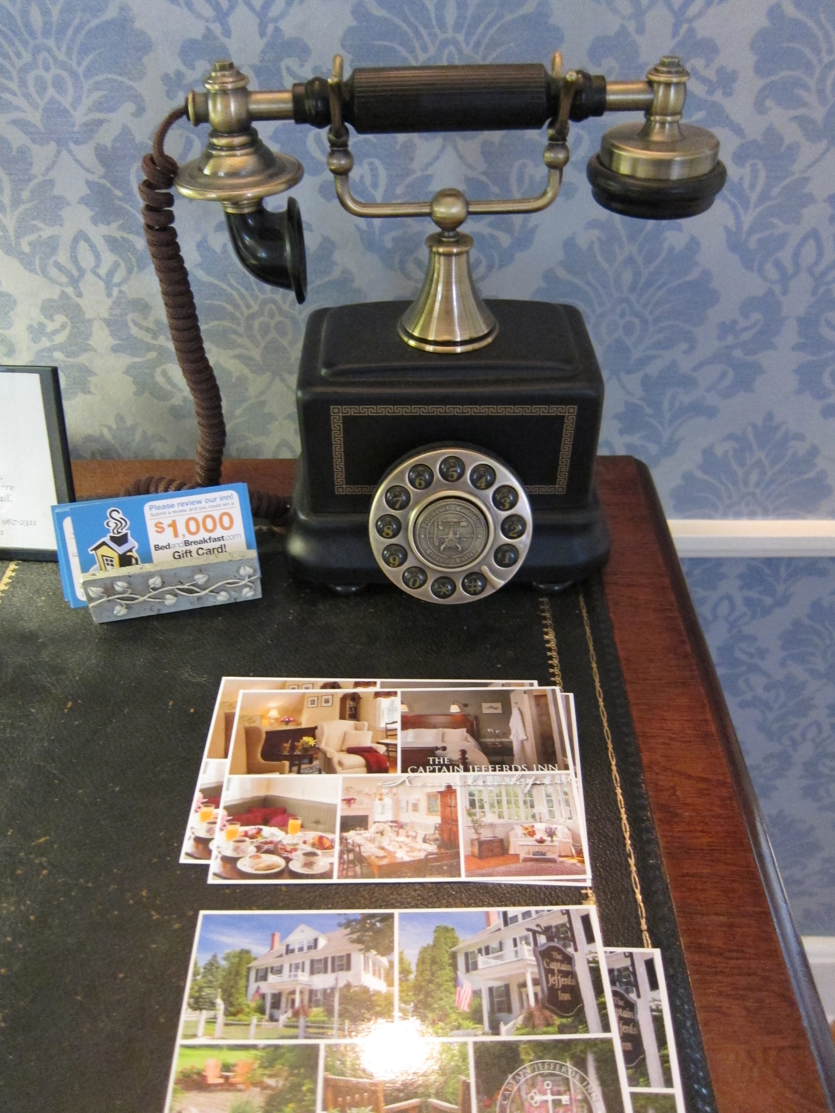 Well, all this was before I stayed at The Captain Jefferds Inn, one of several former sea captains’ mansions in Kennebunkport that’s been converted to a Bed & Breakfast. I guess those salty sea captains, engaged as they were in lucrative trade and shipbuilding, liked having tangible symbols of their wealth and status on full display in the community. It was good of them to provide their left-behind wives with a nice place to hang out in their absence, don’t you think?