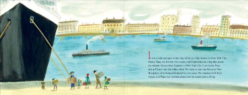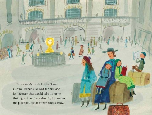 I have several favorites: Her opening page is masterful, with the huge black boat tied up at the dock, juxtaposed against the Frost family, dwarfed by it, walking and carrying their old-fashioned luggage. Two other wonderful ones for me are the double spread pages depicting the family at the newsstand as they discover the “New Republic” magazine on a typical New York City street. The third reflects Rebecca’s version of “Papa thought that any book worth reading twice was worth owning. So instead of buying desserts, we bought books.”
