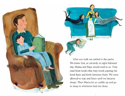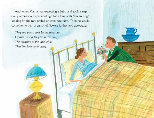 I should read more biographies about poets– so interesting! This one sounds like a good place to start. I love the tender moments like “Then Mama let us cuddle up and go to sleep in whichever bed we chose” and “Papa thought that any book worth reading twice was worth owning. So instead of buying desserts, we bought books.”