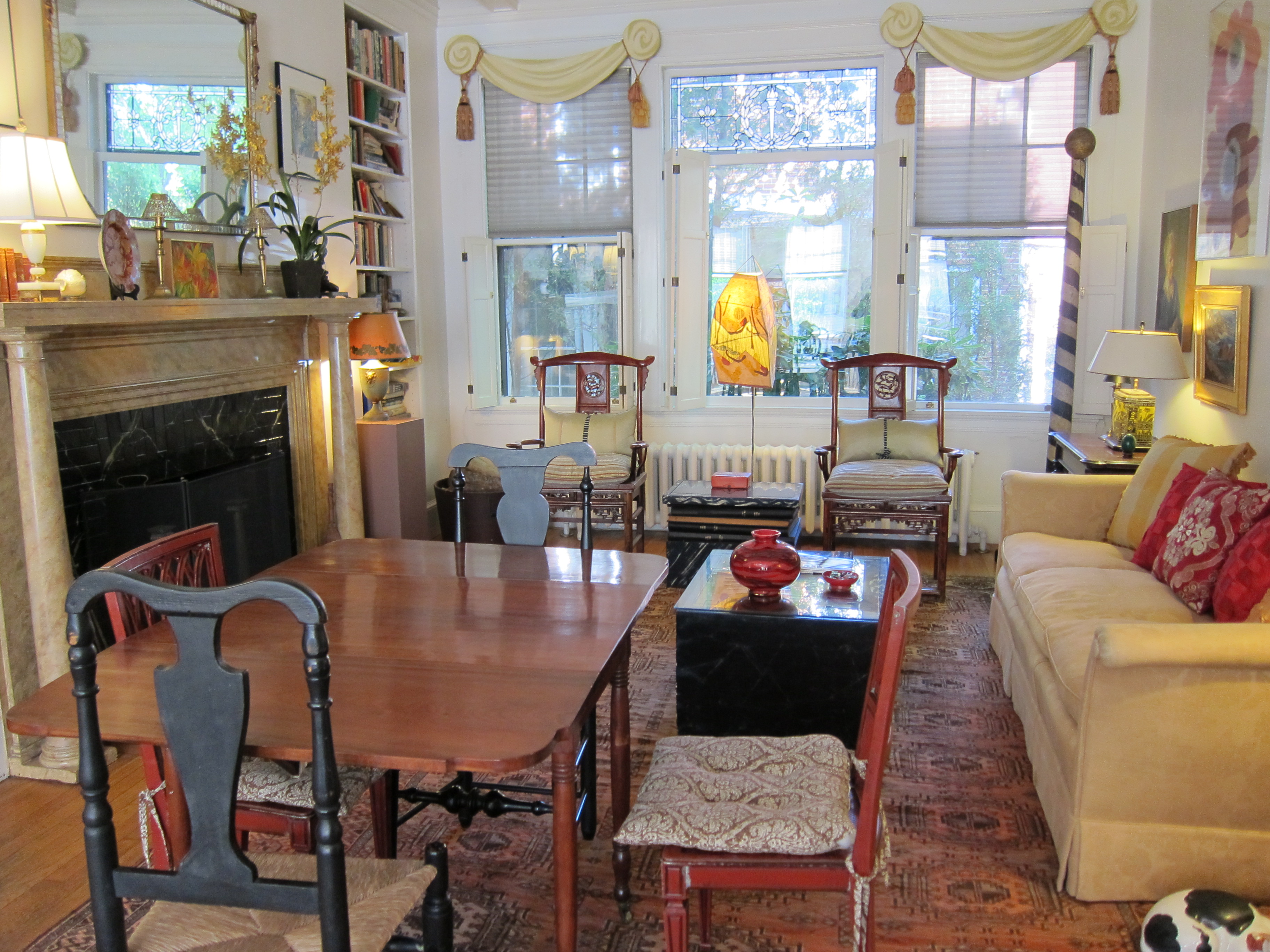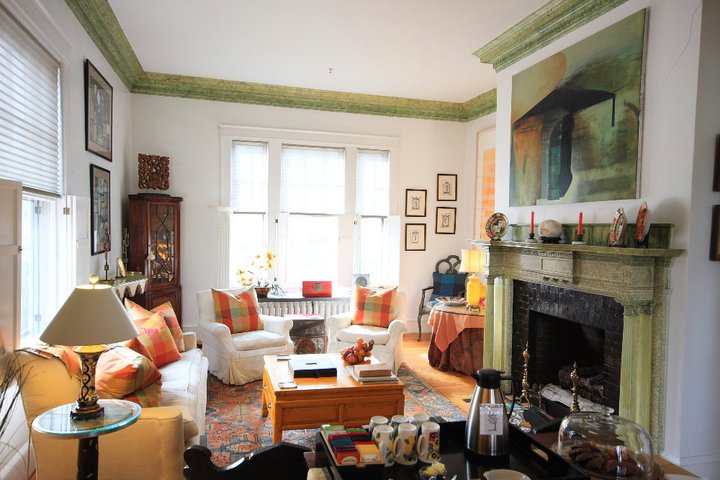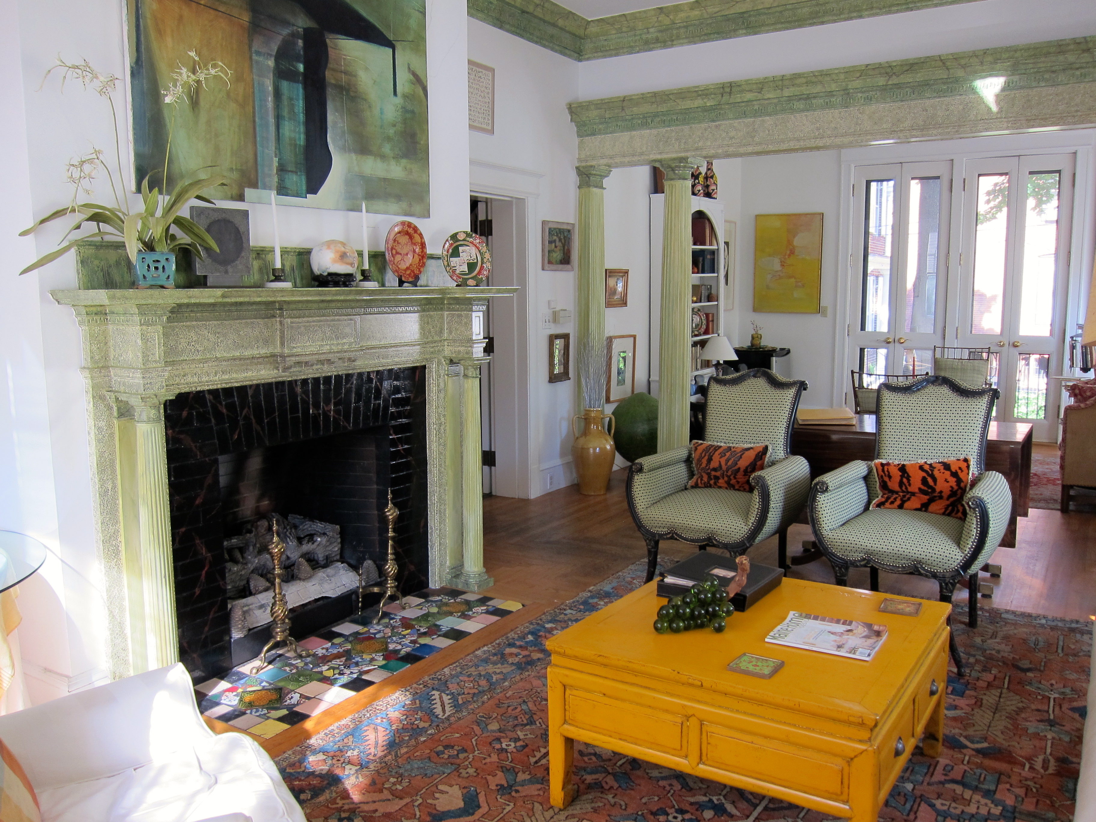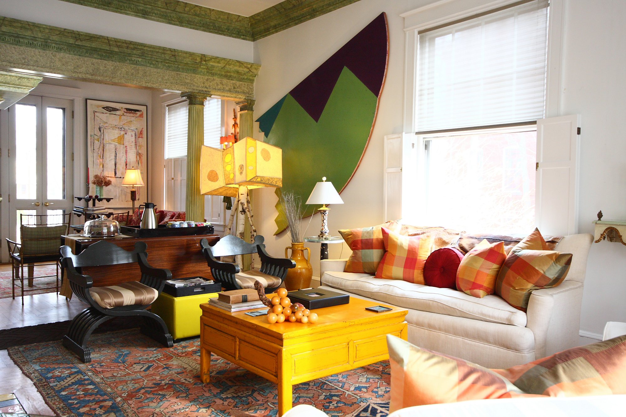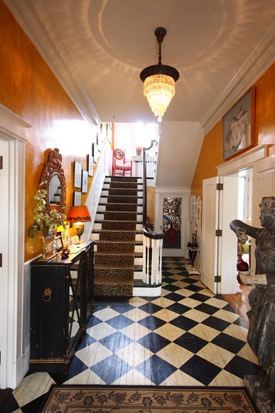 The instant you step into the foyer of this 1884 Italianate mansion, with its black-and-white checkered floors, marigold walls, leopard print stair runner, and serene Persephone tempting you with a frisky pomegranate, you’re so grateful your imaginary artsy friend had to go out of town, leaving you to bask in this sensual celebration of color, texture, patterns, and shapes.