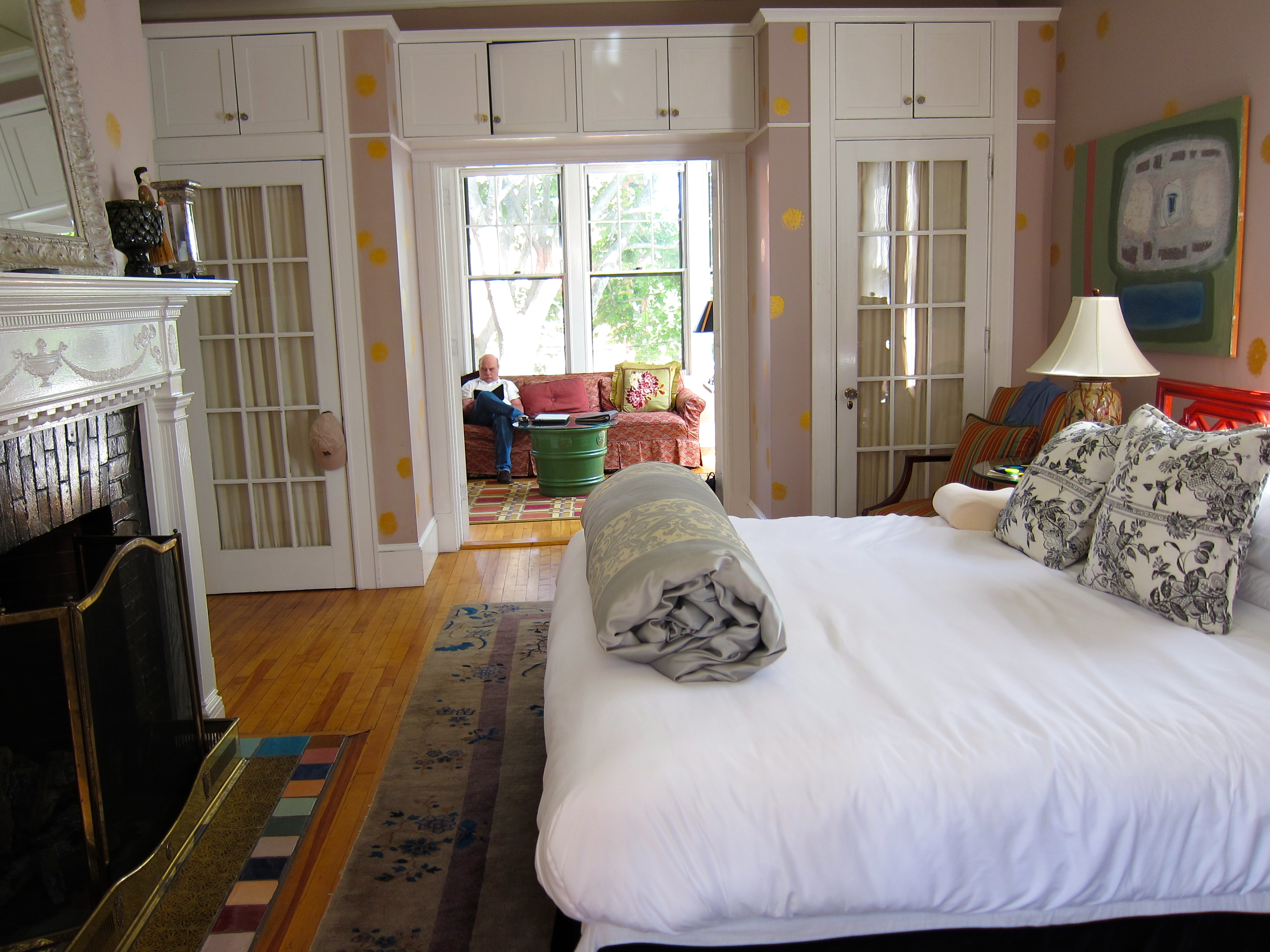 Each of the eight guest rooms is its own visual feast with either handpainted walls (magenta hydrangeas on robin’s egg blue, massive vines, blue irises, birds) or floral wallpaper. We chose Room #8 (gold dots), the original master suite in the house.