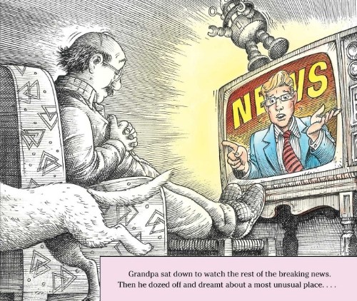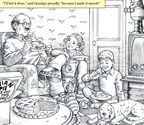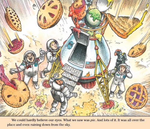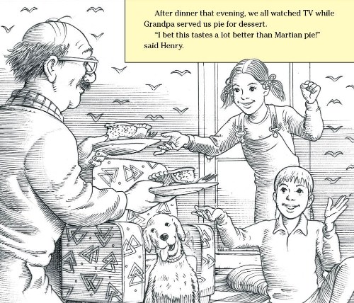Awakened from this delectable dream, Grandpa hears on the news the next morning that the glutinous substance the news reporter speculated was pie filling is actually thick Martian rain. Really? When Kate and Henry see the astronauts’ picture in the newspaper, one of them looks suspiciously like Grandpa. Hmmmm. Later that evening, they eat pie for dessert. Despite the “Martian Pie” carton on the table, Grandpa claims to have baked the pie himself. 🙂