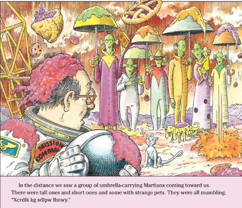 Amidst pies pies pies falling and glopping everywhere (tasty, though), he meets some friendly umbrella-toting Martians who’d apparently been waiting years for him to come. They take Grandpa and his fellow astronauts on a tour, feed them dinner, and explain their “pie problem.”
