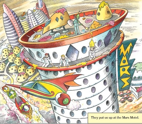 Apparently, even when it comes to pies, there is the possibility (however remote) of getting too much of a good thing (gasp!). The Martians don’t like stepping in pie and having their cars get stuck in it. Despite eating their fill, building “walls, houses, mountains, and sculptures with it,” they can’t keep up with the glutinous glut.