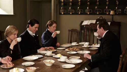 Love how Lady Mary instinctively rings for tea when suitors Lord Gillingham and Evelyn Napier come calling, how Tom Branson hands her a nice cuppa while encouraging her to take up a hobby, and there’s also Rose convincing Anna to accompany her to a tea dance in York. And how about that wonderful scene in the Great Hall with all the dinner guests chit chatting, cups and saucers in hand?